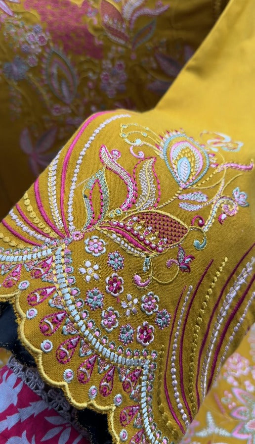 Provide Superb Quality Embroidered Neckline, Front Shirt Cutwork Embroidered Daman Also Attached Laves On Shirt Front, with Plain Dyed Dhanak Trouser